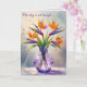 A beautiful arrangement of vibrant orange and purple bird-of-paradise flowers gracefully sits in a clear glass vase, depicted in a modern watercolor artwork.