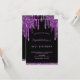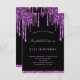 A girly and feminine 21st (or any age) birthday party invitation. On front: A chic black background. Decorated with dark purple faux glitter drips, paint dripping look. Personalise and add a name and party details. The name is written with a hand lettered style script, light purple coloured letters.