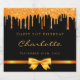 Faux gold coloured ribbon and bow with faux gold glitter drips, paint dripping look.  A chic black background. Personalise and add a name and a date.  With the text. Happy 21st (or any age) Birthday. Golden coloured letters, a modern hand lettered style script.