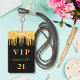 A modern, stylish and glamourous badge for a 21st (or any age) birthday party. A black background with faux gold glitter drip, paint dripping look. The name is written with a modern hand lettered style script with swashes. With the text: VIP Number 21 is written in a golden colour. To keep the swashes only delete the sample name, leave the spaces or emoji's in front and after the name.