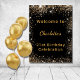 A welcome poster for a girly and glamourous 21st (or any age) birthday party. A stylish black background decorated with faux gold glitter dust. Personalise and add a name and age. Golden letters.
