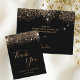A thank you card for a 50th (or any age) birthday. A black background colour, decorated with faux gold glitter. On front large dark golden coloured hand lettered script and the text: Thank You, your text, title and a date.