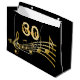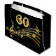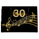 Black background with faux gold music notes for a 30th birthday. Templates for the age 30 and name. The name is written in a hand-lettered style script. Golden letters and number.