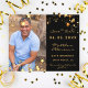 On front: Add a vertical size photo. A classic black background colour, decorated with faux gold stars. Personalise and add a name and details. Golden letters. For both him and her.