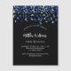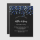 A modern, elegant and invitation. A black background decorated with blue confetti. Personalise and add a name and details. White text.