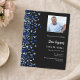 A modern, elegant and invitation. A black background decorated with blue confetti. Personalise and add photo, a name and party details. White text.