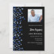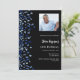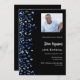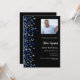 A modern, elegant and invitation. A black background decorated with blue confetti. Personalise and add photo, a name and party details. White text.