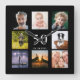 A wall clock as a gift for a 50th (or any age) birthday for a guy, celebrating his life with a collage of 8 of your own photos. Personalise and add age 50, and a date. Date of birth or the date of the anniversary. White coloured letters. Black background.