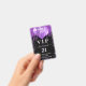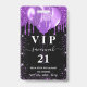 A modern, stylish and glamourous badge for a 21st (or any age) birthday party. A black background with purple faux glitter drips, paint dripping look and balloons. With the text: VIP. Personalise and add name, age, address/date.