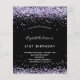 A girly and feminine 21st (or any age) birthday party invitation. On front: A chic black background. Decorated with purple, violet faux glitter dust. Personalise and add a name and party details. The name is written with a hand lettered style script.