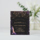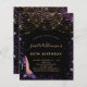 For an elegant 50th (or any age) birthday. A stylish black background. Decorated with purple faux gold glitter dust and a golden light strings, a purple stiletto shoe. Personalise and add a name, age and party details. The name is written with a hand lettered style script