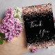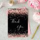 A feminine and elegant birthday thank you card. A black background colour. With rose gold confetti. On front large hand lettered script and the text: Thank You.
