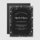 A stylish black background. Decorated with faux silver glitter, sparkles. Personalise and add a name, age and party details. The name is written with a hand lettered style script
