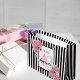 Classic slim black and white vertical stripes as background. With girly, feminine and romantic pink flowers, roses as decoration. Perfect for an elegant 40th birthday party for her. A white and black frame with templates for name, age and a date. Age number 40 in pink, name and date in black. The name is written with a hand lettered style script.
