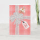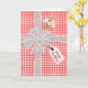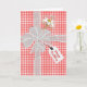 White sheer bow with white daisy and gift tag on white and red gingham pattern.