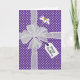 White sheer bow with white daisy and gift tag on white and purple polka dot pattern.