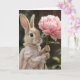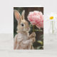 A charming rabbit is dressed in a delicate lace-trimmed dress and holds a large, blooming pink peony.