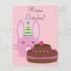 Cute bunny is ready for his birthday party and wants a piece of his delicious looking chocolate cake. Feel free to add your own text!