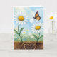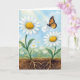 A vibrant watercolor illustration depicts a monarch butterfly delivering mail to a daisy with a heart-shaped root in garden soil.