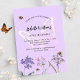 A violet, lavender coloured background. Decorated with bees and painted wildflowers in violet and pink and a large butterfly. Personalise and add a name and party details.