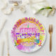 Beautiful bright and colourful, personalised birthday party plates. Design includes happy birthday in a half circle on the upper part of the plate, a birthday cake and, a banner with stars that has the child's name. Colours include, yellow, pink, purple, aqua, orange and more. Just add your personal message at the personalise prompt, then select colours at the customise prompt. HAMbyWhiteGlove aka HAMbyWG