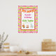 A personalised birthday party gift table poster. Designed with a cute illustration of a smiling lion wearing a party hat, a fuzzy sheep with birthday balloons and a birthday cake with 3 candles.. Set on a pink, green and yellow geometric pattern. Perfect for 3 year old's birthday but also good for birthdays of all ages.