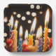 Close-up of melting glowing birthday candles with bokeh lighting background.