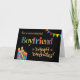A bright and colourful Birthday card for a Boyfriend, with Birthday Cake Candles, Bunting and Stars and the word, 'Teacher' in patterned lettering, outlined in gold-effect (not metallic ink) and Happy Birthday, also in gold-effect, all on a black background. A digital design by Judy Adamson.