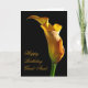 A stately golden arum lily stands lit from the side . A perfect flower to convey your birthday wishes.