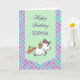 Foldable birthday card with customisable text. Green ribbon with a pastel mermaid scale background and a cute unicorn.