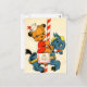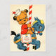 Cute vintage birthday card illustration of a little bear in a sailor suit and hat riding on a blue carousel horse. The horse has a "saddle" that has a birthday cake and candles on it.