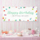 Polka dotted happy birthday banner design that can be personalised with your text and choice of background colour.