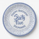 Milestone number 65. This over-the-hill design has a blue and white random number pattern with a blue milestone number 65 repeated in varied sizes and angles over a white background. There is a white circle in the centre for your text, and blue l and white rings around the rim. This is a cool idea for your 65th, birthday party or for all occasions, personal or professional, where you celebrate the number sixty-five. Easily personalise the encircled text using the template provided.