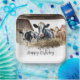 Three watercolor cows by barn feed trough filled with hay with text for birthday party.