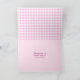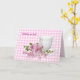 White cup and saucer with pink peony and rhinestones on pink and white gingham pattern birthday.