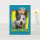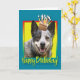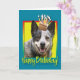 Celebrate a birthday with this whimsical Australian Cattle Dog Greeting Card. With a cupcake balanced on it's head, this design is sure to bring a smile and giggles! BTW, This design has several versions, with different background colours. There is also an invitation to a Party version.