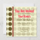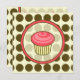 An invitation featuring a pink cupcake outlined in brown inside a matching pink and brown frame. Background is polka dots over beige. Opposite side features matching polka dot background with brown and pink text over sheer side. Personalise with details of your event.
