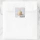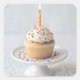 A single vanilla cupcake topped with swirled frosting and colorful sprinkles, featuring a lit striped candle on a pedestal plate with white lace