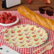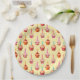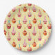 Sweet party plates with colorful cupcake pattern on light yellow polka dot background.