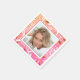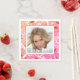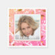 An elegant and modern botanical pattern of branches and leaves in pink, peach colour and white as background. Rustic and faded colours. A slim white frame and template for Your photo. White text overlay: Hello 60! A napkin for a 60th birthday party.
