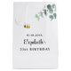 A chic white background. Decorated with watercolored eucalyptus greenery, foliage and a cute, happy smiling bee. Personalise and add a name. The name is written with a modern hand lettered style script.