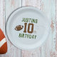 This design features a birthday boy sports football party, a simple minimalist ball athlete, a kids child children birthday party, a sports themed birthday party ball, a simple athlete name number year, a minimalist minimal whimsical cute, a funny fun football birthday party, a cute fun whimsical typography font, a minimal modern athletic number, a fun birthday paper plate