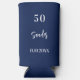 For a 50th (or any age) birthday party. A dark blue background. Add your name, age, date. The name is written with a modern hand lettered style script. White text.