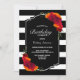 Black and white striped birthday dinner party invitation featuring elegant red and orange floral displays. Text is fully customisable to enable you to include all of your own information for your birthday celebration.