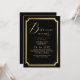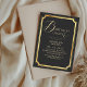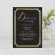 Modern stylish birthday party invitation black with gold dust on with a gold ink pour effect (the gold is a digital effect, not real foil) and modern calligraphy. Classy and elegant, simple and modern invitation.