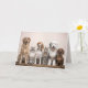 A lineup of varied dog and cat breeds sits on a wooden bench, showcasing their charm.