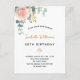 An elegant invitation for a 50th (or any age) birthday party. A chic white background. Decorated with a rose gold and blush pink watercolored rose flower, floral, green eucalyptus leaves, sprigs, greenery and a faux gold sprig. Personalise and the name and party details. Black and golden letters. The name is written with a modern hand lettered style script.