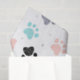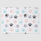 This design features pink blue and grey dog paw prints in a seamless pattern over a white background. This is perfect for wrapping dog birthday presents.