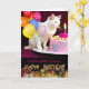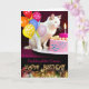 Birthday paper greeting card for a goddaughter. Add her name to the cover of the card. A white cat is holding colourful balloons and staring at a birthday cake candle. Art, image, and verse copyright © Shoaff Ballanger Studios, 2023.