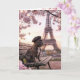A French bulldog in a beret sits on a bench amidst cherry blossoms, with the Eiffel Tower creating a charming backdrop for a perfect Parisian springtime scene